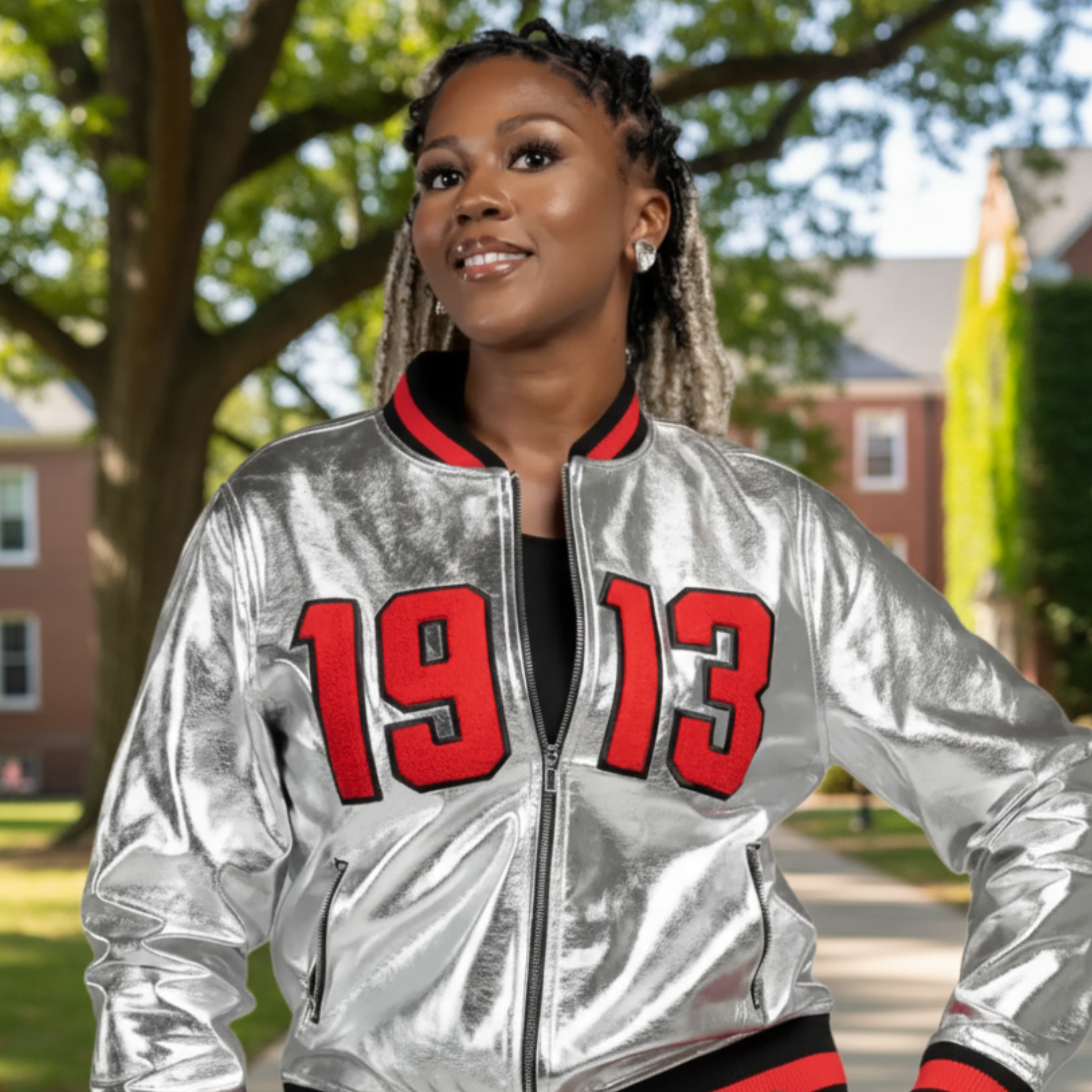 This 1913 silver bomber jacket with black and red ribbing is embellished with chenille numbers for women is perfect when you want to make a statement!