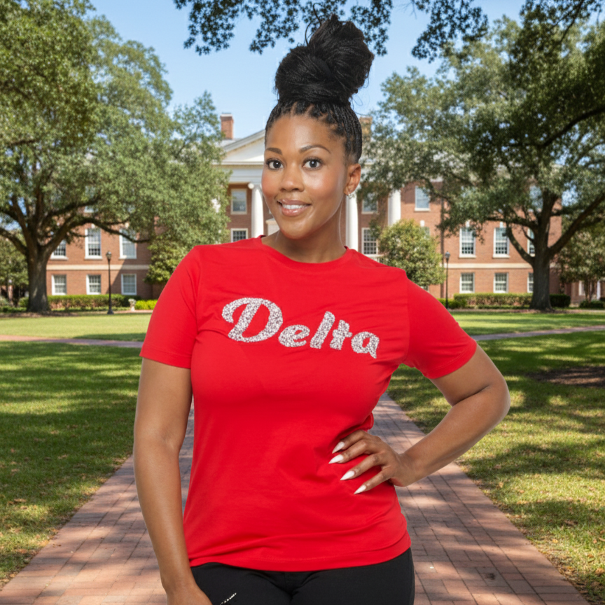 Make a bold statement with our Red 'Delta' Diamond Shirt Top. This eye-catching piece blends timeless style with a modern twist, featuring sparkling rhinestone detailing that proudly displays "Delta" in bold letters. Crafted with soft, breathable fabric, this top offers both comfort and style for every occasion. Perfect for showcasing your Delta pride while maintaining a chic, sophisticated look. Whether you're at a casual gathering or an event, this top ensures you stand out effortlessly.